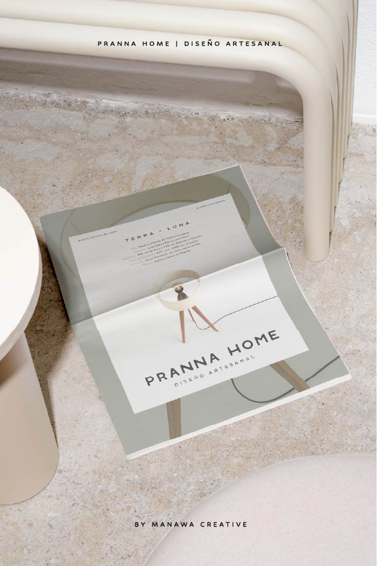 Publicidad de Pranna Home en revista con la lámpara Luna, pieza artesanal incluida en el branding desarrollado por Manawa Creative.