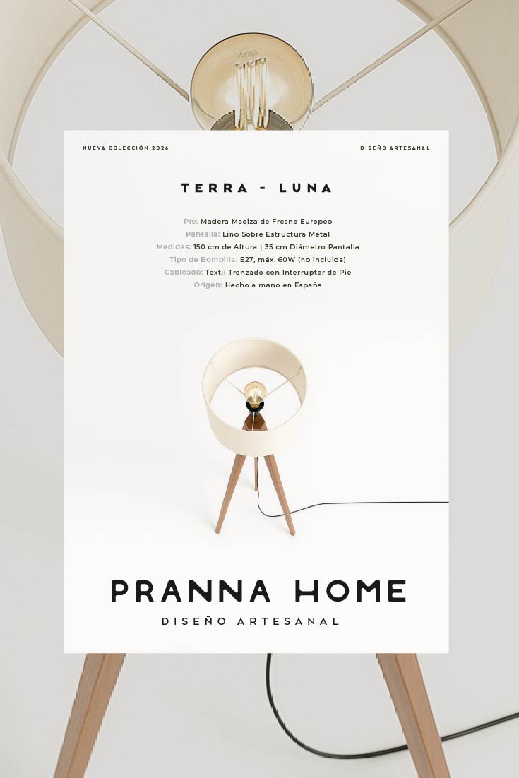 Catálogo de Pranna Home con lámpara Terra Luna, pieza artesanal incluida en el branding desarrollado por Manawa Creative.