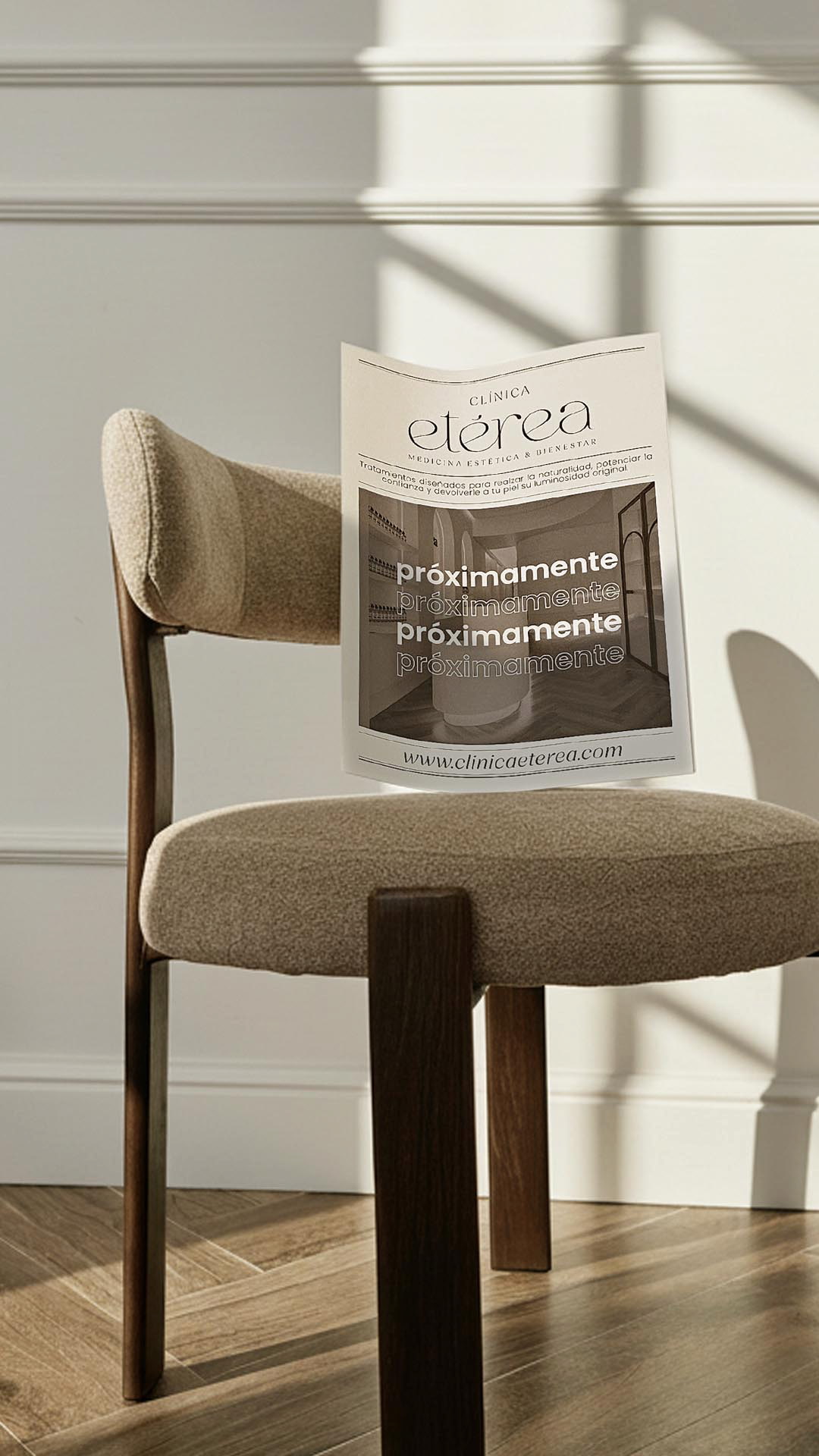 Flyer promocional diseñado con la identidad visual de Clínica Etérea, mostrando el estilo elegante y minimalista del branding estratégico desarrollado para su apertura en Valencia.