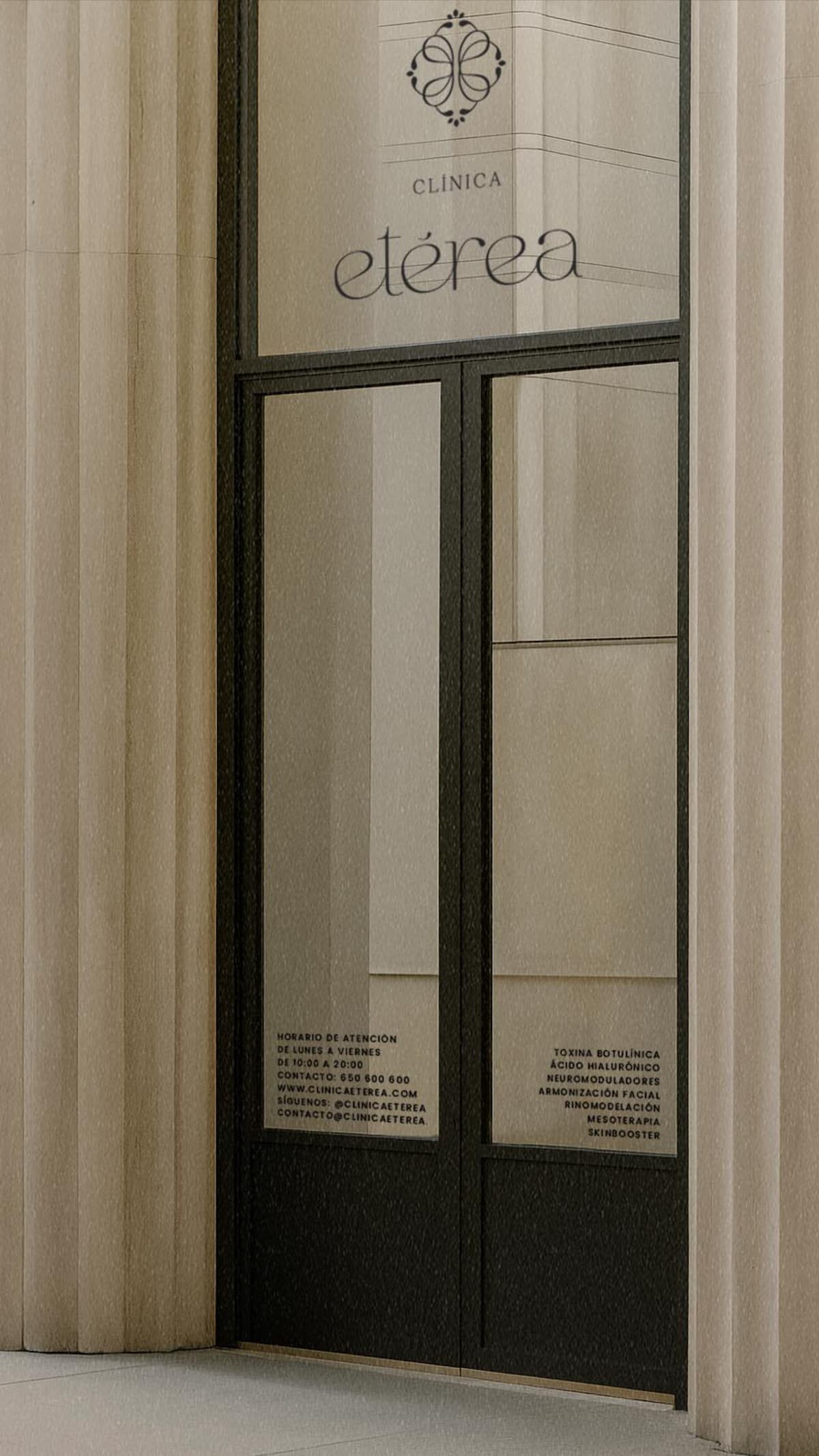 Diseño de identidad visual para Clínica Etérea, mostrando la aplicación del logotipo en la fachada principal. Un branding elegante, minimalista y estratégico creado por Manawa Creative para transmitir profesionalidad, bienestar y confianza.