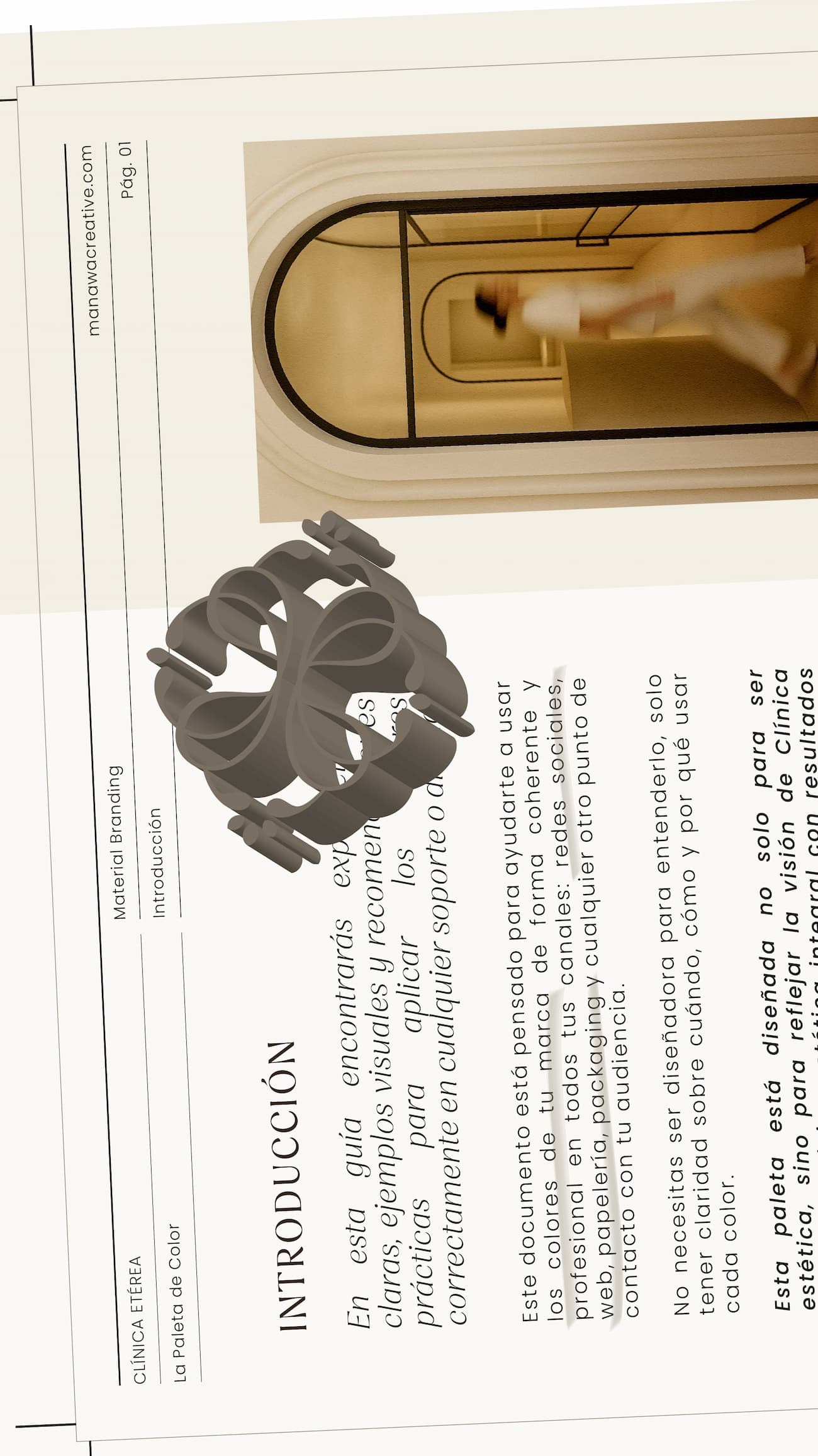 Guía de marca de Clínica Etérea con el isotipo desarrollado en 3D para mostrar su estructura, volumen y coherencia visual. Material incluido dentro del manual de identidad diseñado por Manawa Creative para reforzar la estrategia de marca.