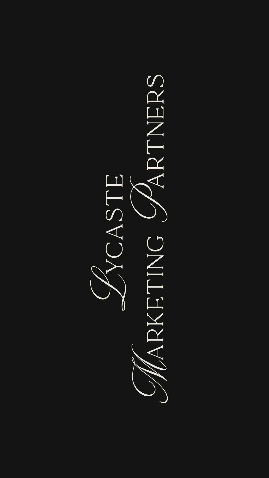 Versión vertical del logotipo de Lycaste Marketing Partners aplicada en fondo negro para transmitir contraste editorial, exclusividad y autoridad visual. Diseño creado por Manawa Creative como parte de la identidad visual premium de la marca.