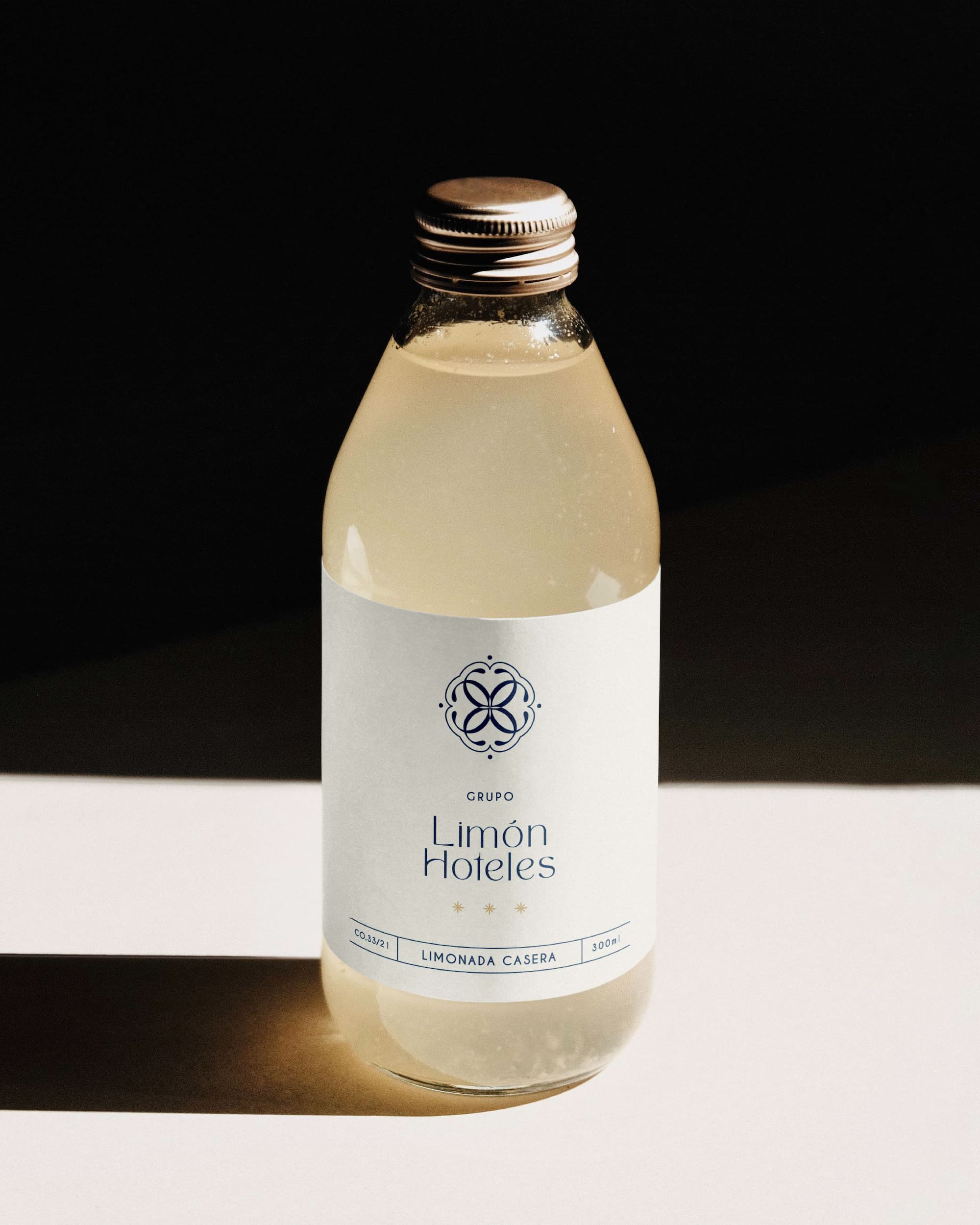 Botella de limonada con etiqueta de Grupo Limón Hoteles sobre fondo oscuro.