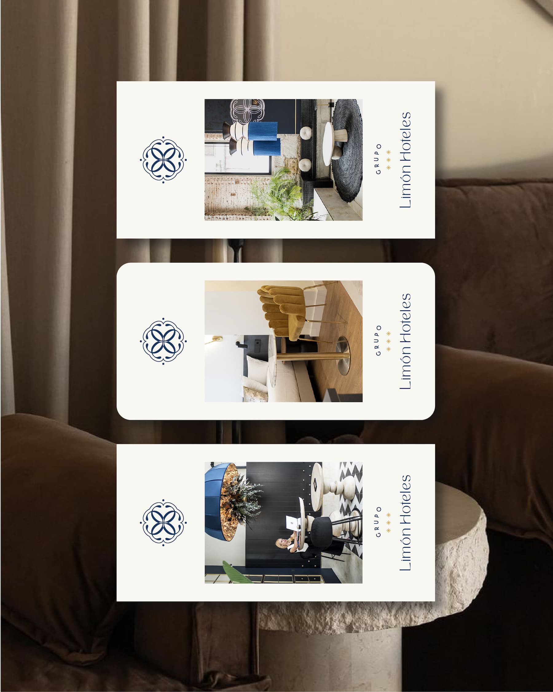En este conjunto de mockups verticales se muestra la versatilidad del branding del Grupo Limón Hoteles. Desde la recepción hasta los materiales gráficos, todo comunica una imagen sólida y coherente.