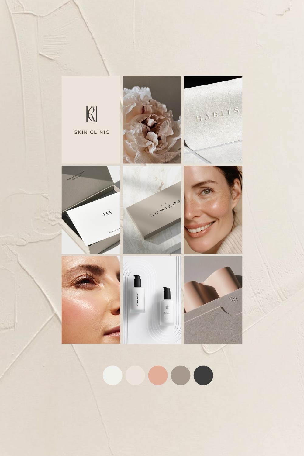 Esta imagen presenta el moodboard inicial creado para el rebranding de Clínica Art Face. A través de colores neutros, texturas suaves, packaging minimalista y rostros reales, construimos una base visual que comunica naturalidad, honestidad y elegancia: los tres pilares estratégicos de la nueva marca.